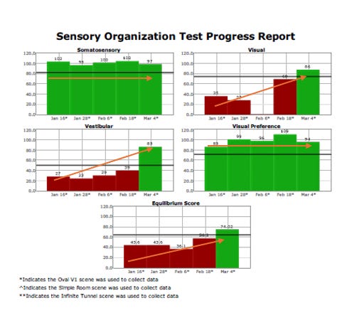Despite the substantial progress, Pete continues to exhibit a degree of surface dependency (SVM - Sensory Mismatch). This means he still relies too heavily on somatosensory cues, particularly when visual or vestibular information is compromised. While his overall balance has improved, this lingering dependency can manifest as subtle instability, especially on uneven surfaces or in situations requiring rapid postural adjustments.