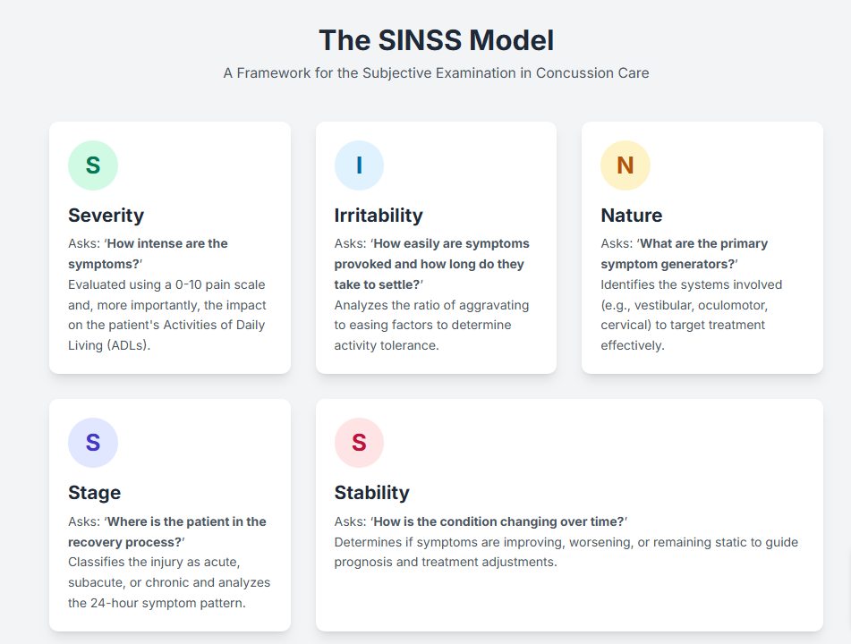 For therapists specializing in vestibular and post-concussion management, the subjective examination is arguably the most critical component of the entire assessment. It is where we uncover the nuances of a patient’s experience, which guides a safe, effective, and targeted physical examination and treatment plan. The SINSS model, a powerful tool that organizes subjective information into five key domains, is not just effective in concussion care but also universally applicable to nearly any patient presentation. It helps us to be more empathetic and understanding, as we center our clinical reasoning on the unique experiences of each patient.