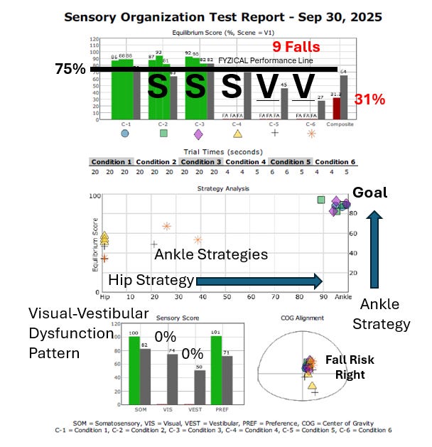 The objective findings from a patient on Ozempic confirm the pathology predicted by the statistical cohort. This patient’s Dizziness Handicap Inventory (DHI) score—a measure of perceived functional, emotional, and physical difficulty—was a catastrophic 78 points. SOT testing (see below) showed a profound vestibular dysfunction pattern defined as a SVVM (Somatosensory > Visual-Vestibular Mismatch). This means that, because the vestibular system is not responding, the brain is relying more on her feet and eyes for sensory input, leading to persistent dizziness.