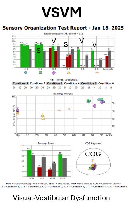 The simplest and most accurate way to identify these dependencies is to measure postural sway objectively using computerized balance testing. We achieve this by integrating a high-precision force plate with virtual reality (VR) goggles and infrared tracking. This combination allows the clinician to quantify the exact degree of sway and torque during the six-condition Clinical Test of Sensory Interaction and Balance (CTSIB).